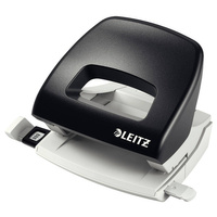 - Niewielkich rozmiarów dziurkacz z uchwytem wykonanym ze wzmocnionego plastiku, z metalową podstawą