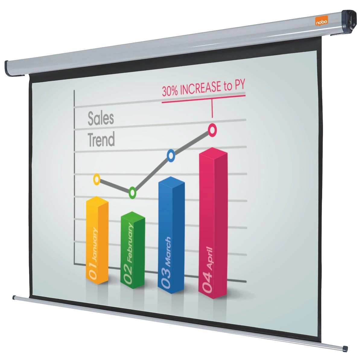 - Przygotuj profesjonalną prezentację z elektrycznym ekranem ściennym Nobo przeznaczonym do stosowania zarówno w dużych, jak i małych salach konferencyjnych Użyj pilota, aby opuścić ekran, i gotowe!