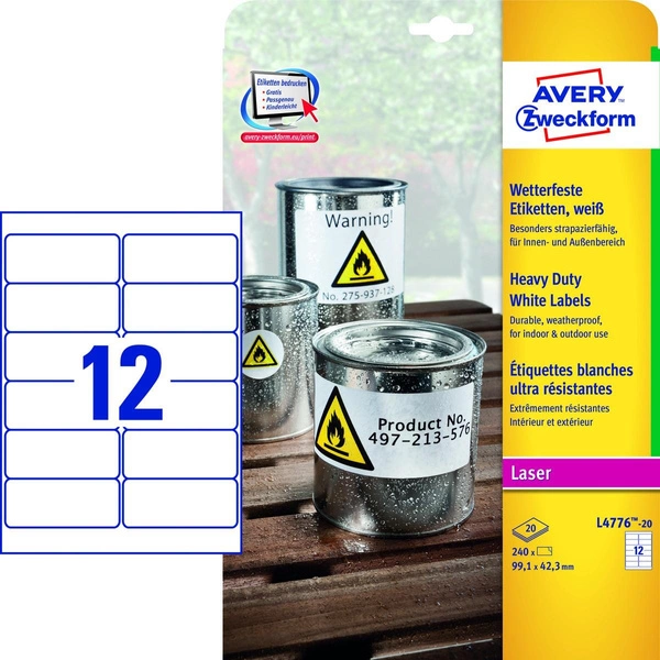 - Etykiety samoprzylepne wykonane z białego poliestru.
