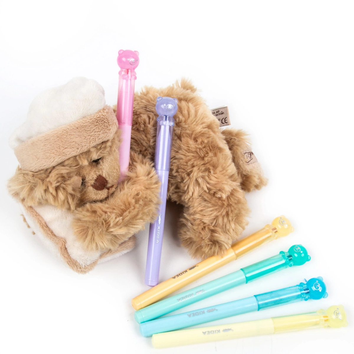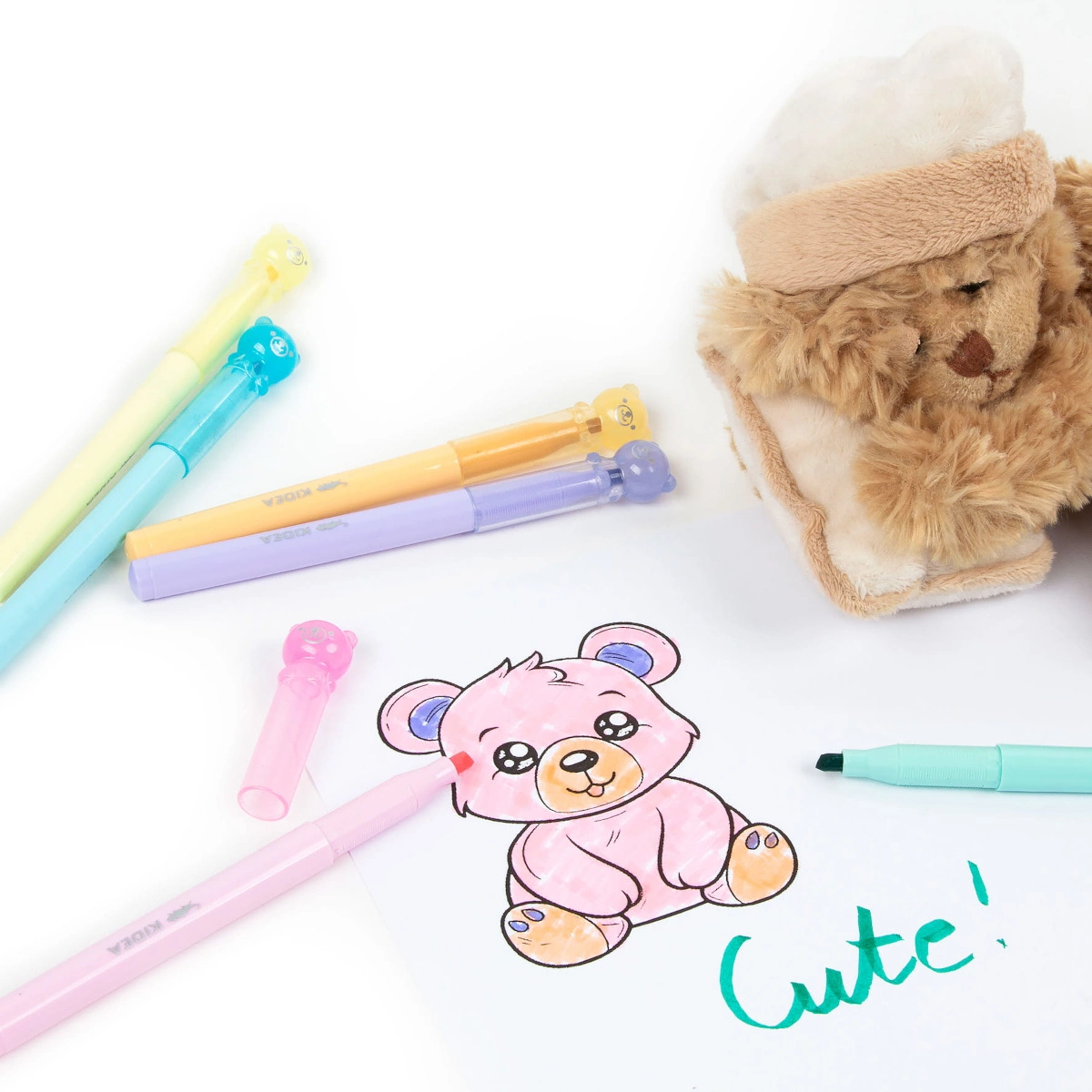 • Zakrętki w kształcie misiów dodają flamastrom uroku, a ich zaokrąglona końcówka idealnie sprawdza się podczas rysowania, podkreślania czy pisania.