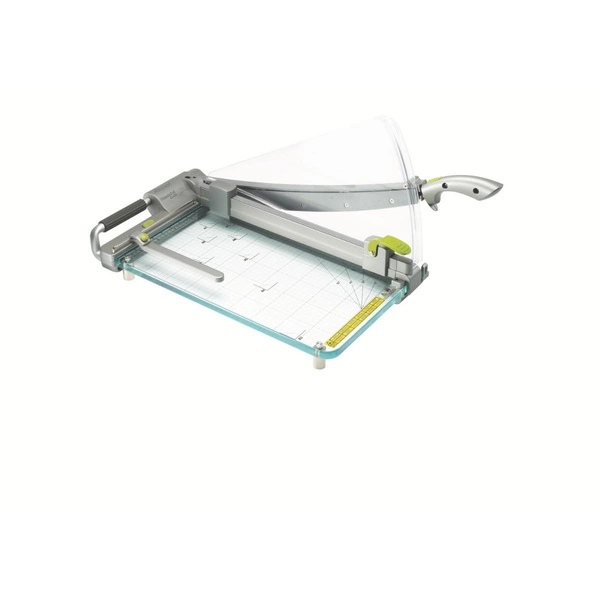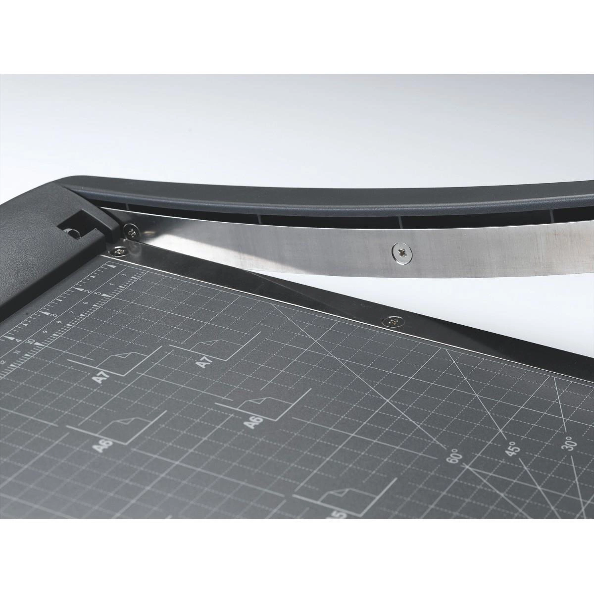 - Wyposażona w stabilną podstawę z oznaczeniami formatów i zaznaczonymi liniami siatki zapewniającymi precyzyjne cięcie