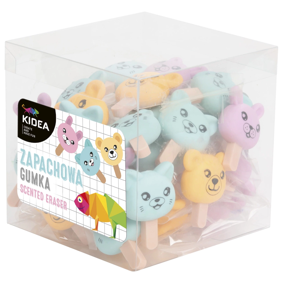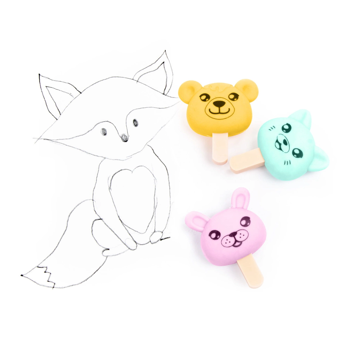 - Gumki do mazania w kształcie zwierzaków: kotka, króliczka oraz misia i słodkim zapachu wanilii, karmelu i truskawki.