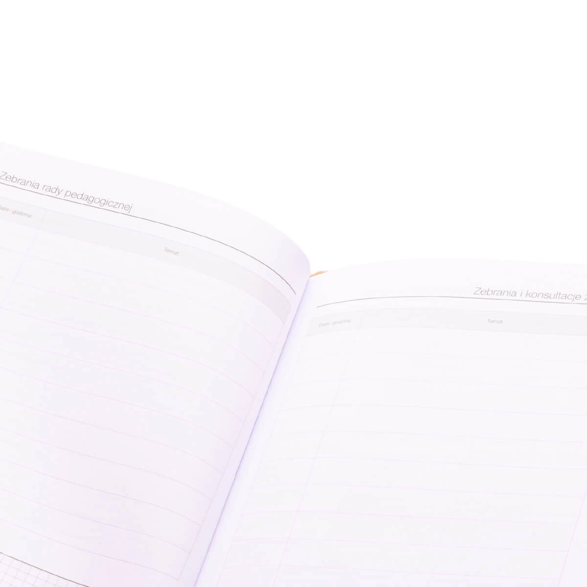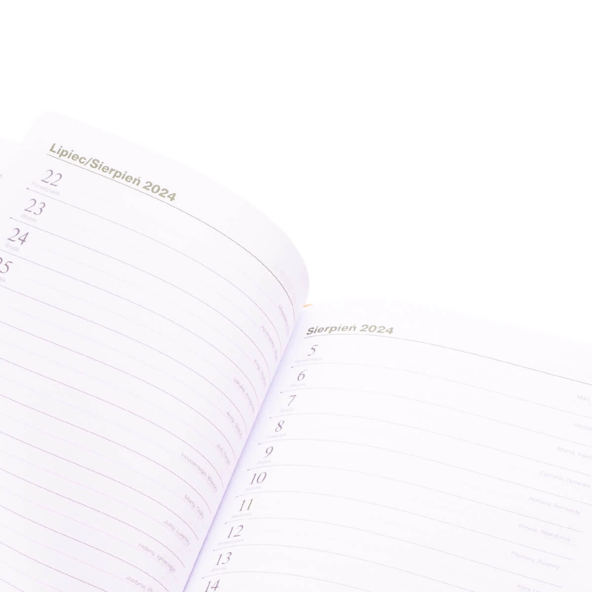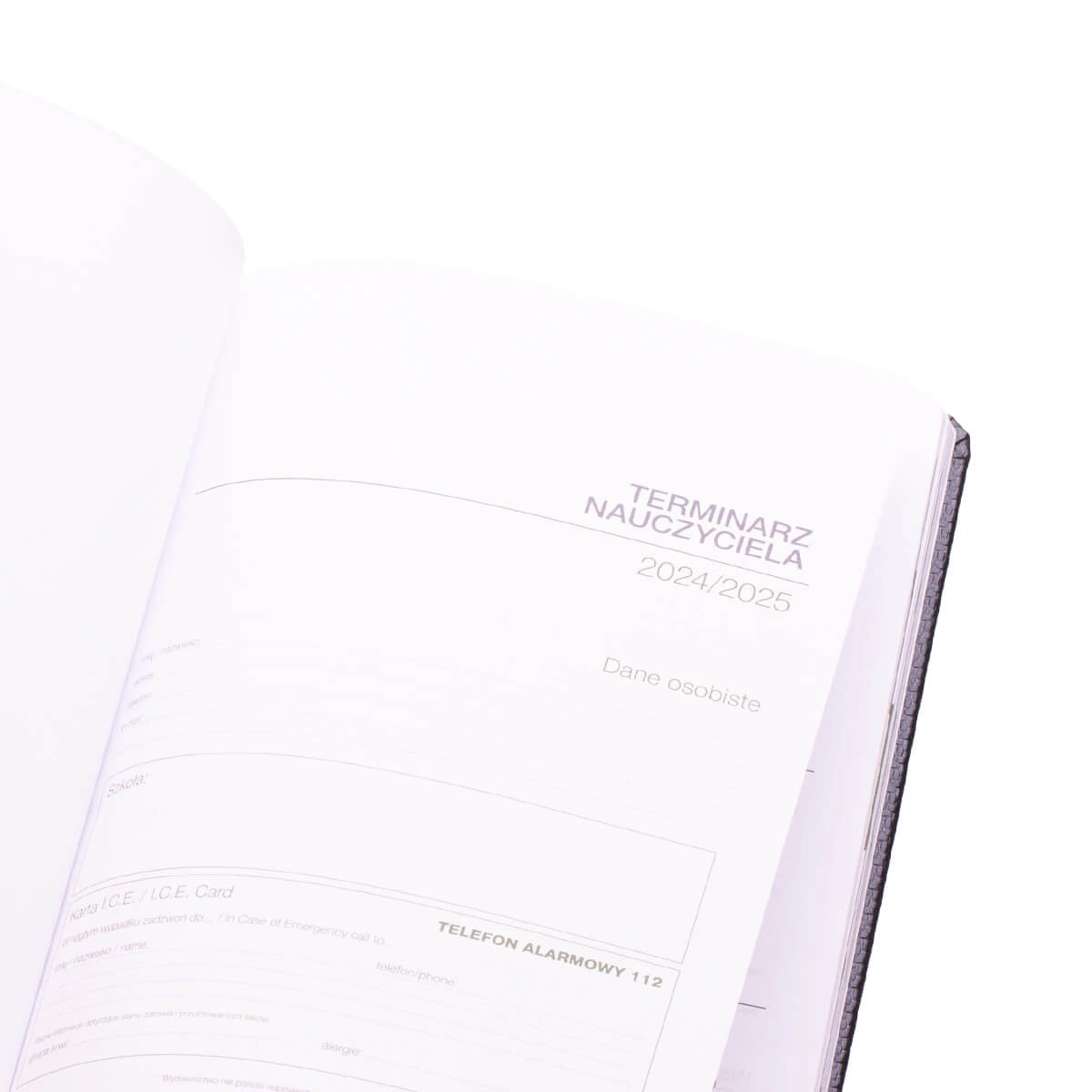 Kalendarz z charakterystycznym układem kalendarium, odejmujący od IX 2024 do VIII 2025, przeznaczony dla pedagogów i nauczycieli. W Terminarzu Nauczyciela znajdują się niezbędne pedagogom dodatkowe strony zawierające plany lekcji, tabele z danymi uczniów, arkusze ocen i kartki na notatki, sprzyjające lepszej organizacji czasu pracy i ułatwiające planowanie zajęć.