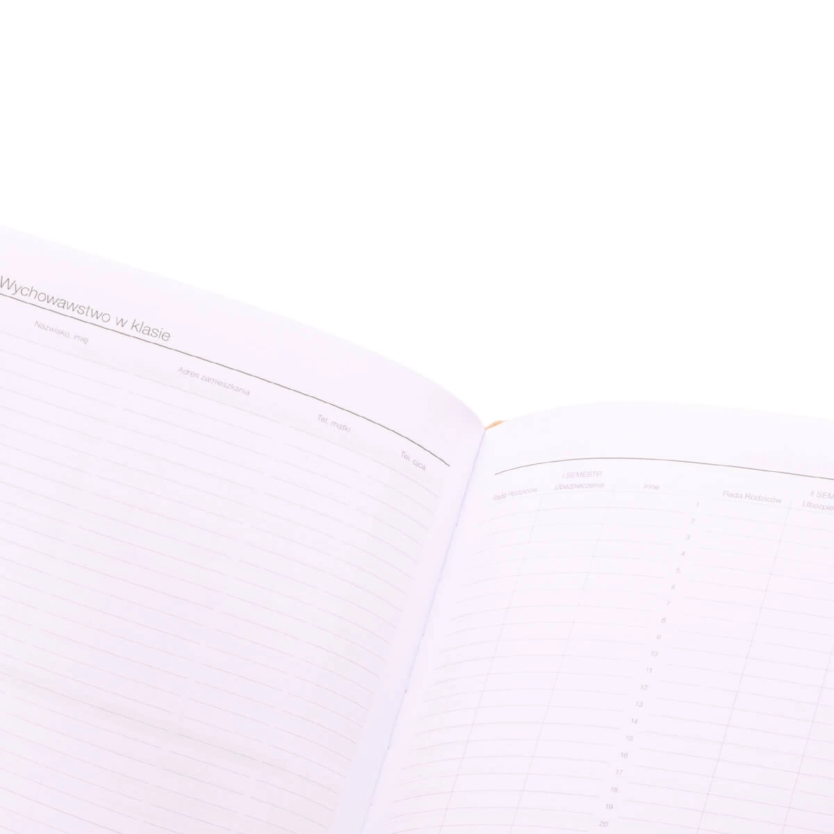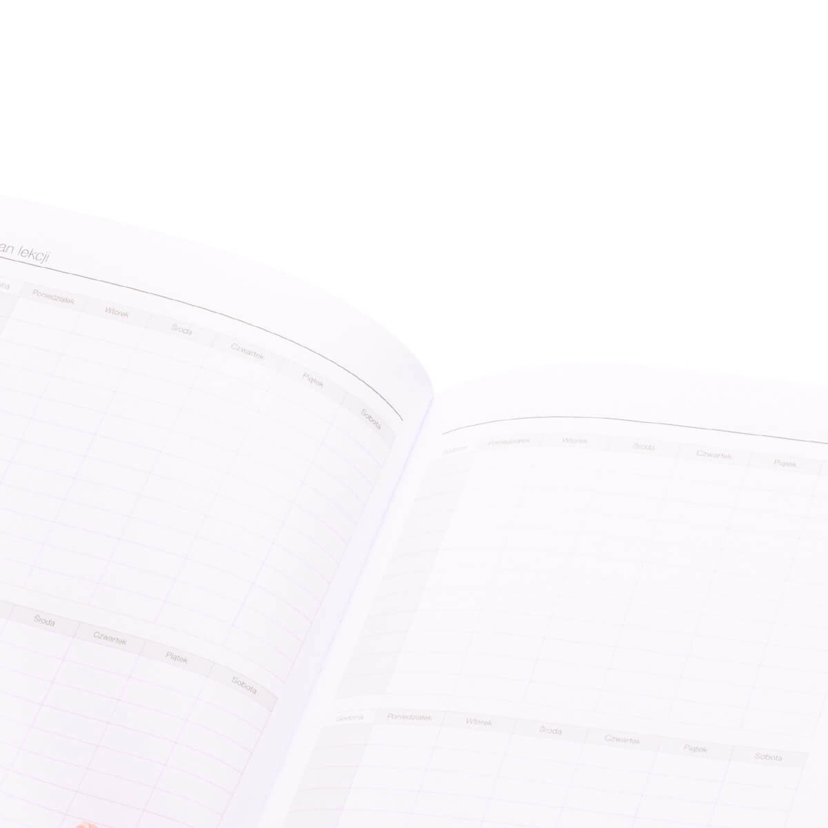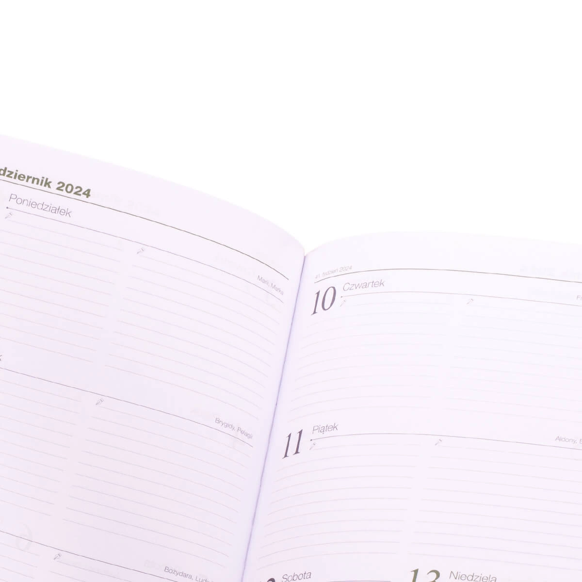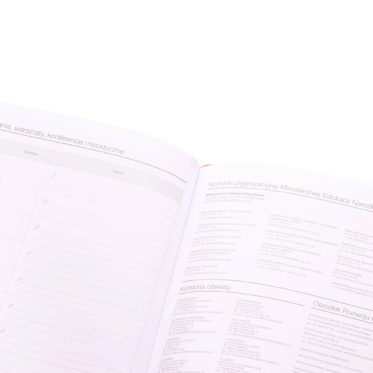 Kalendarz z charakterystycznym układem kalendarium, odejmujący od IX 2024 do VIII 2025, przeznaczony dla pedagogów i nauczycieli. W Terminarzu Nauczyciela znajdują się niezbędne pedagogom dodatkowe strony zawierające plany lekcji, tabele z danymi uczniów, arkusze ocen i kartki na notatki, sprzyjające lepszej organizacji czasu pracy i ułatwiające planowanie zajęć.