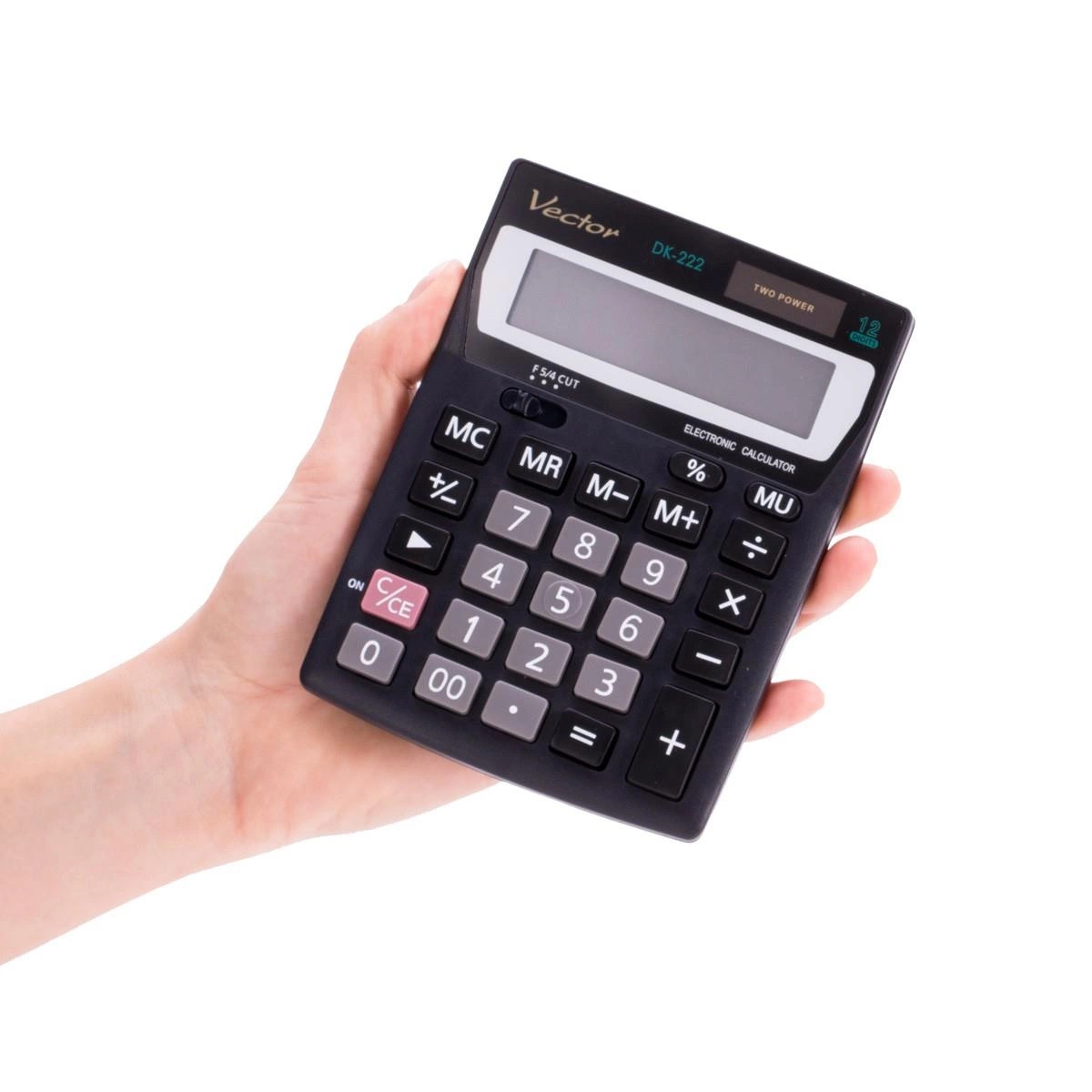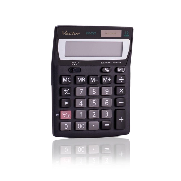 Kalkulator biurowy Vector DK-222 to niewielkich rozmiarów urządzenie biurowe służące do wykonywania podstawowych działań i rachunków. Duże klawisze ułatwiają wpisywanie liczb, natomiast ekran mieszczący dwanaście pozycji oraz funkcja zaokrąglania wyniku do określonego miejsca po przecinku pozwalają na szybkie i sprawne odczytywanie uzyskanych wartości. W razie przypadkowego wciśnięcia niewłaściwego przycisku kalkulator posiada funkcję wymazania ostatniej wprowadzonej cyfry. Urządzenie posiada mały panel fotowoltaiczny, który dostarcza potrzebną ilość energii do użytkowania kalkulatora w jasno oświetlonych pomieszczeniach. Przy niedoborze światła dodatkowa moc zostanie pobrana z wbudowanej bateryjki.