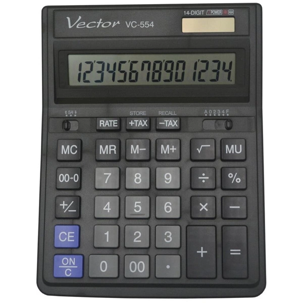 Kalkulator biurowy Vector VC-554 wyposażony został w duży wyświetlacz na czternaście pozycji oraz zaokrąglanie liczb które ułatwia błyskawiczne odczytywanie uzyskanych wyników. Bardzo przydatny jest klawisz cofania, który pozwala usunąć ostatnią wprowadzoną cyfrę i zastąpić ją prawidłową. Podwójna pamięć wspomaga liczenie bardziej skomplikowanych działań, bez potrzeby zapisywania wyników częściowych na osobnej kartce papieru. Kalkulator posiada również niewielką baterię słoneczną, która zasila urządzenie nawet przy niewielkim poziomie nasłonecznienia. Dodatkowo posiada drugie źródło zasilania jakim jest wbudowana bateria, zapewniającą działanie w każdych warunkach.