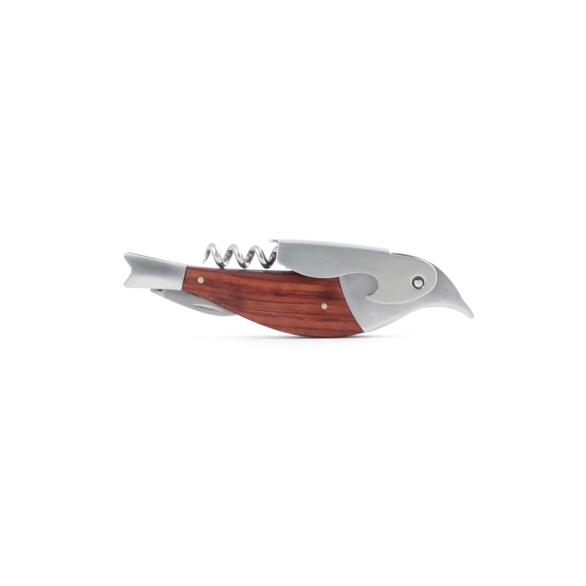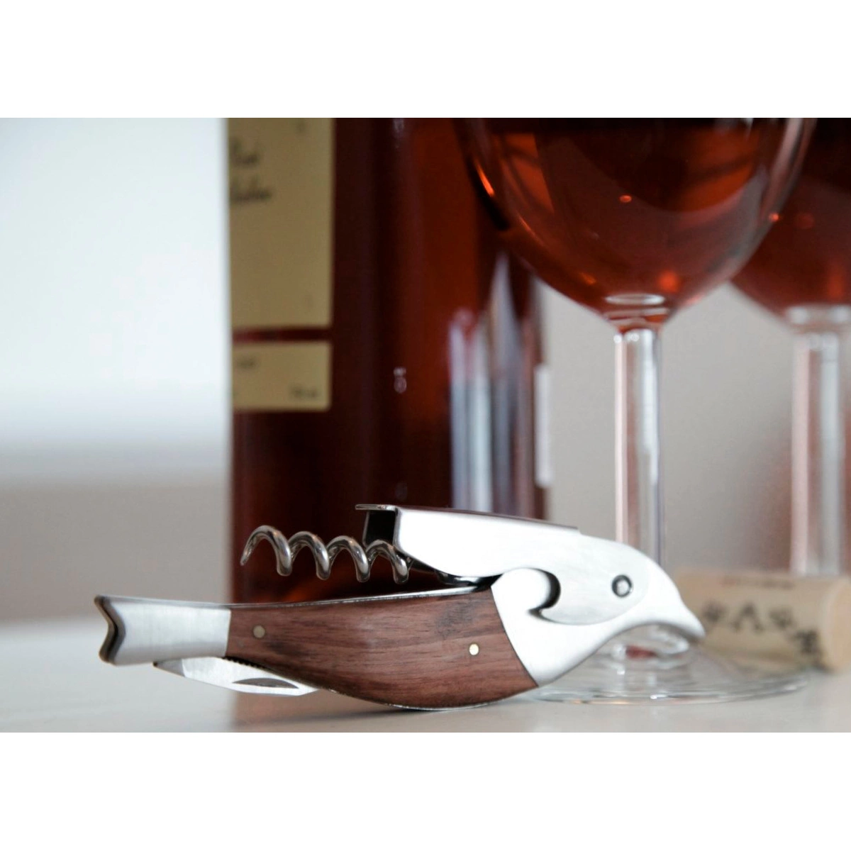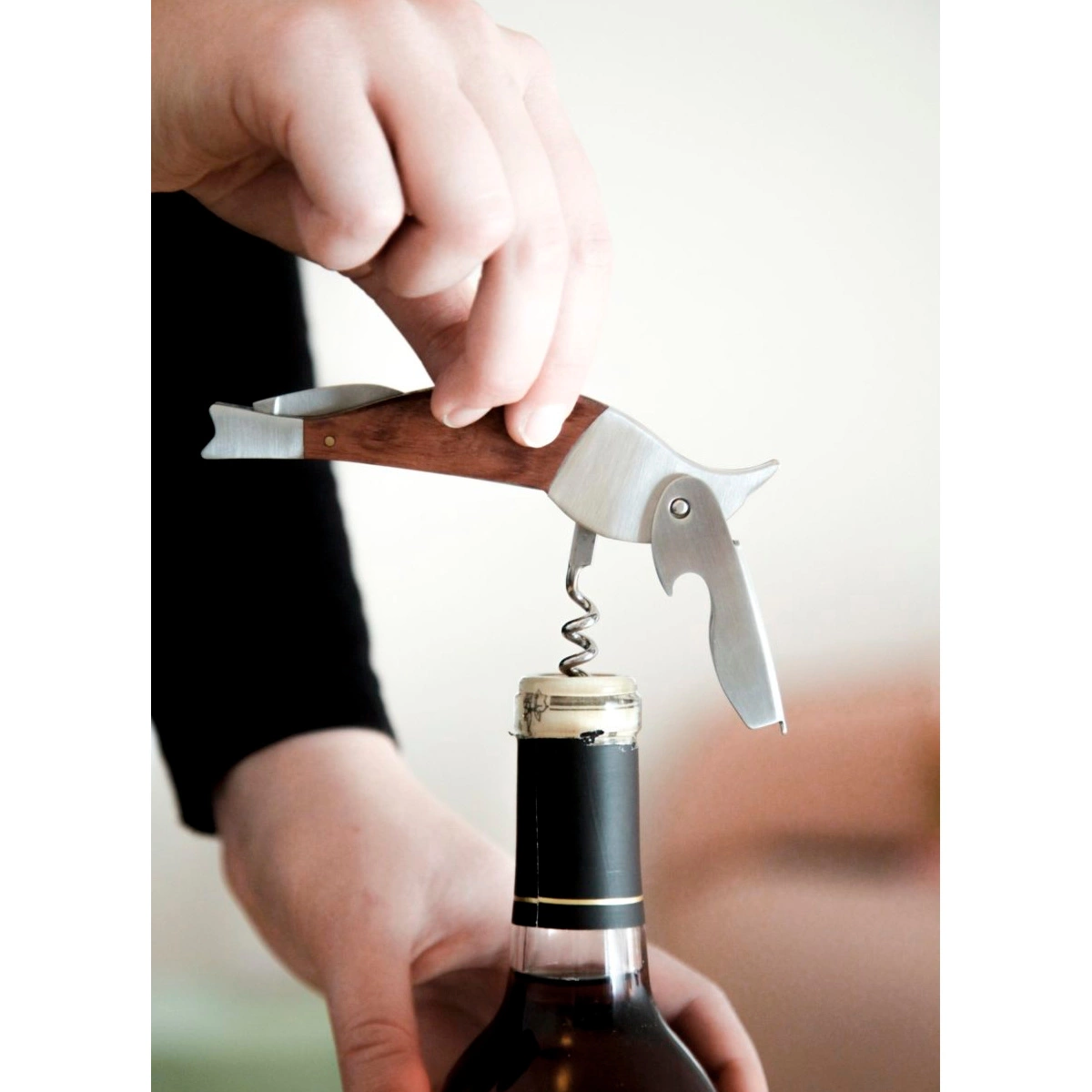 - Korkociąg i otwieracz do butelek wykonany ze stali nierdzewnej z drewnianym wykończeniem.