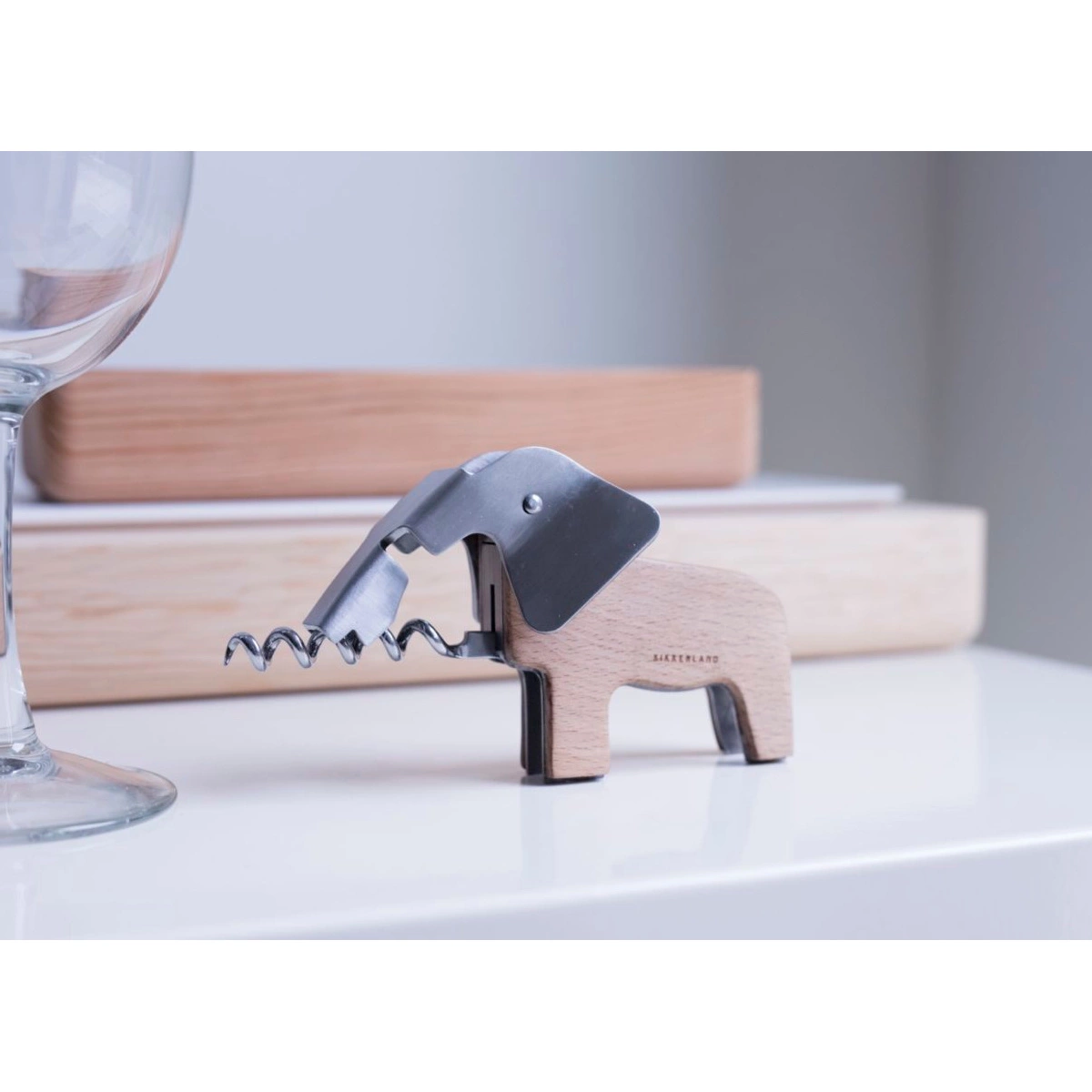 - Przybiera kształt słonia, trąba to otwieracz do butelek, a ogon to korkociąg.