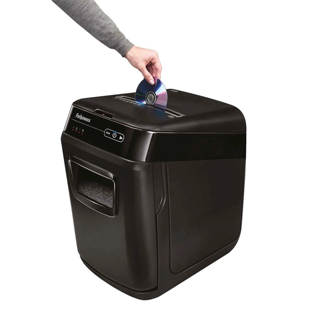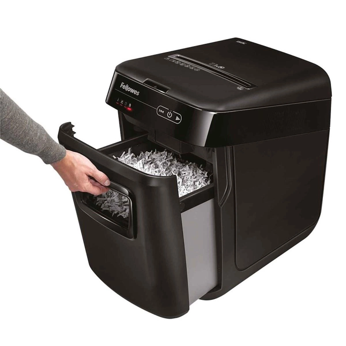 - Prosta w obsłudze – wystarczy włożyć dokumenty do podajnika, włączyć przycisk niszczenia i można wrócić do swoich obowiązków – resztę wykona niszczarka za Ciebie