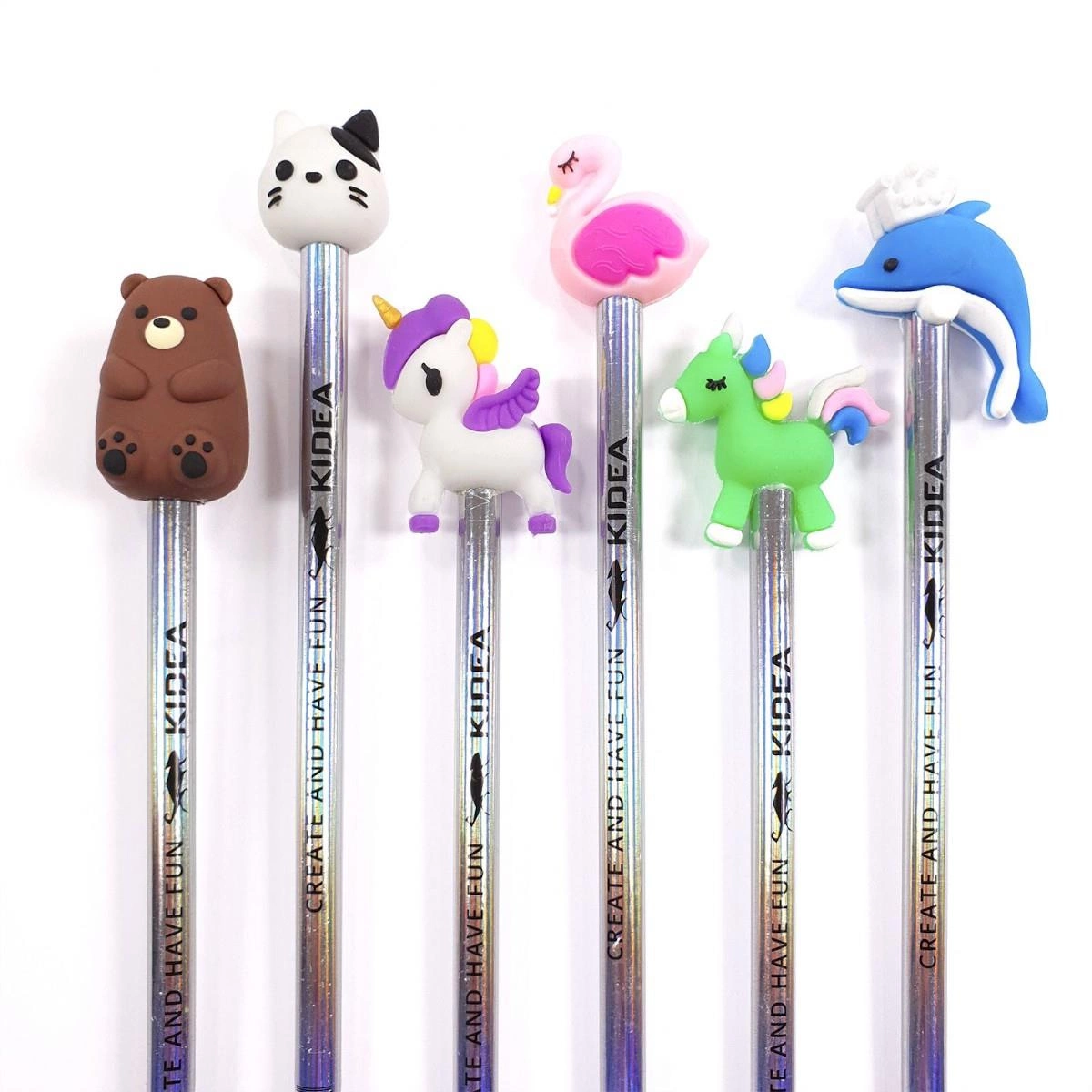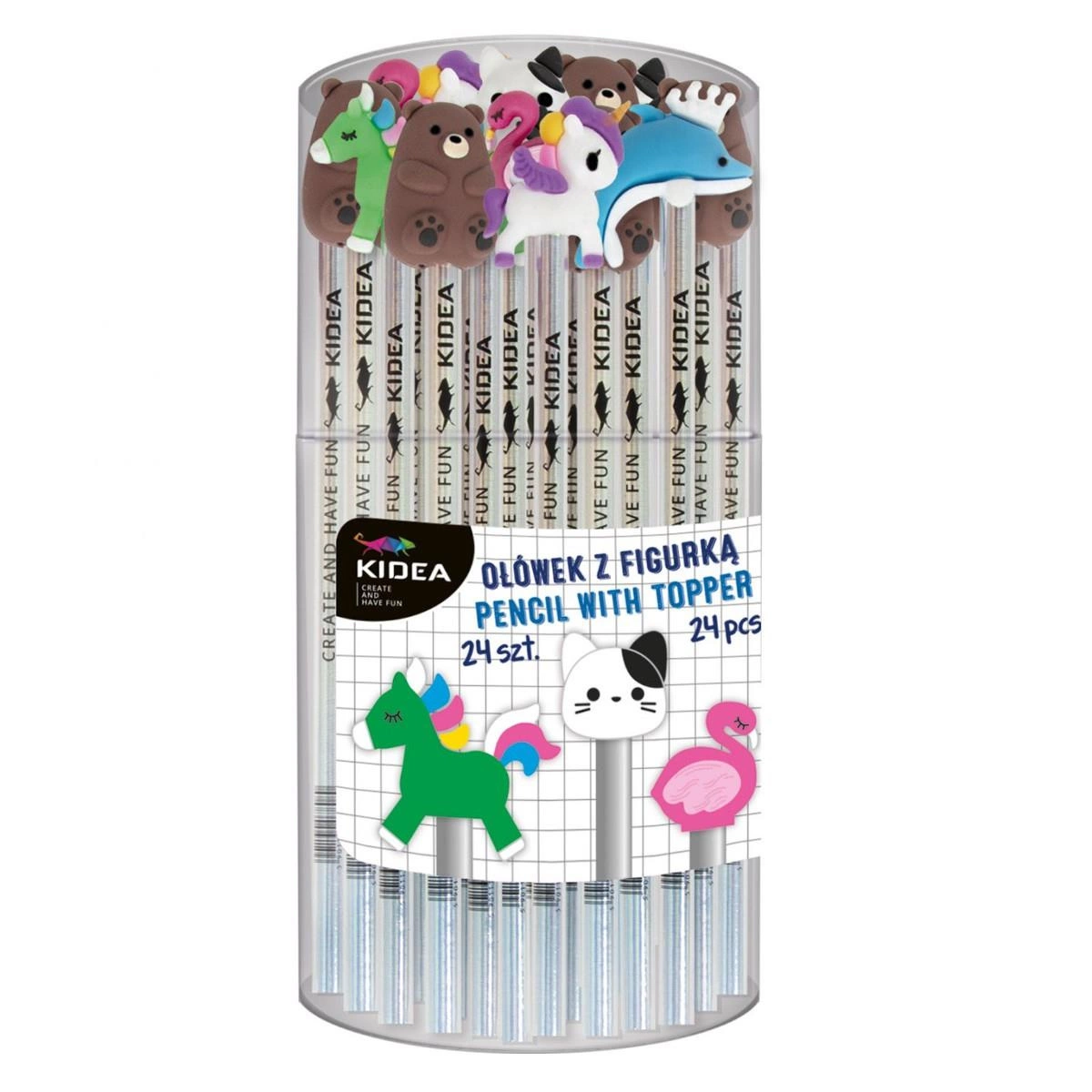 • Drewniane ołówki w kolorze srebrnym z rysikiem HB zakończone gumowymi figurkami