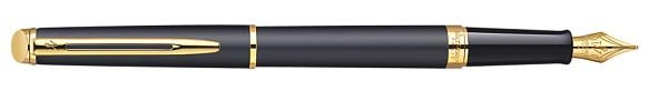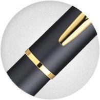 - Lśniące, pokryte czarnym matem korpus i nasadka tworzą idealny kontrast z platerowanymi 23-karatowym złotem wykończeniami. Pióro wyposażone jest w stalówkę z wysokiej jakości stali platerowaną 23-karatowym złotem.