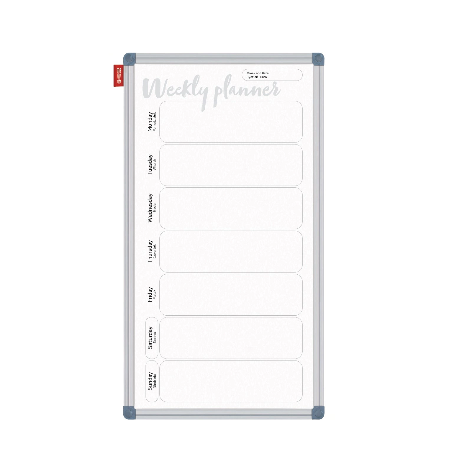 - Tablica z powierzchnią suchościeralno-magnetyczną z nadrukowanym terminarzem do planowania zadań tygodniowych