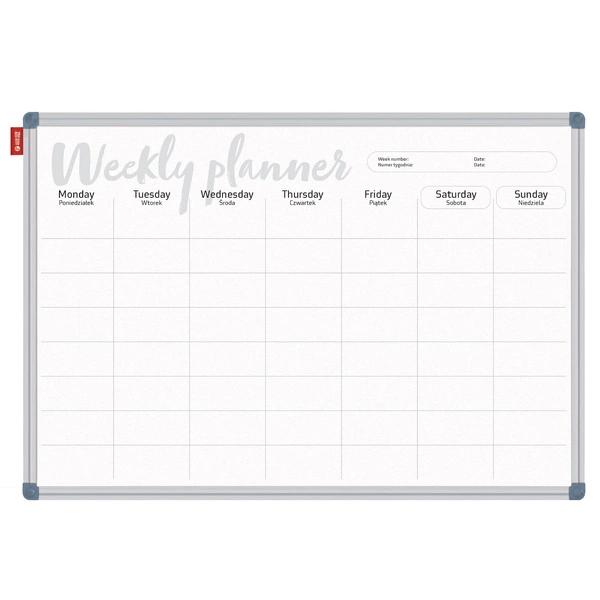 • Tablica z powierzchnią suchościeralno-magnetyczną z nadrukowanym terminarzem do planowania zadań tygodniowych