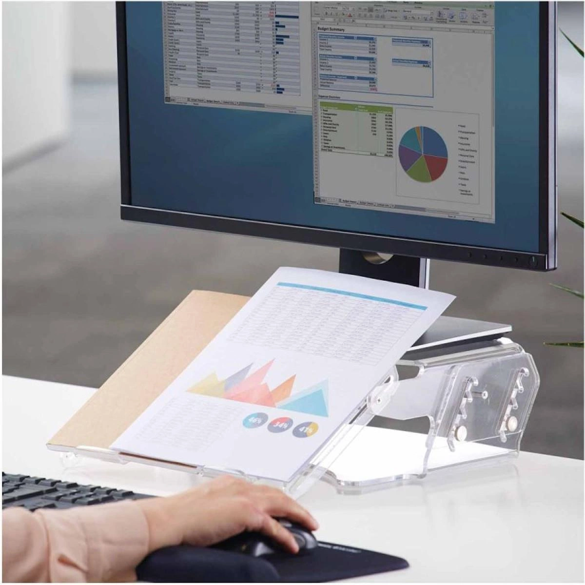 - Składana podstawka na dokumenty pozwala na ustawienie ich bezpośrednio przed sobą w trakcie pracy
