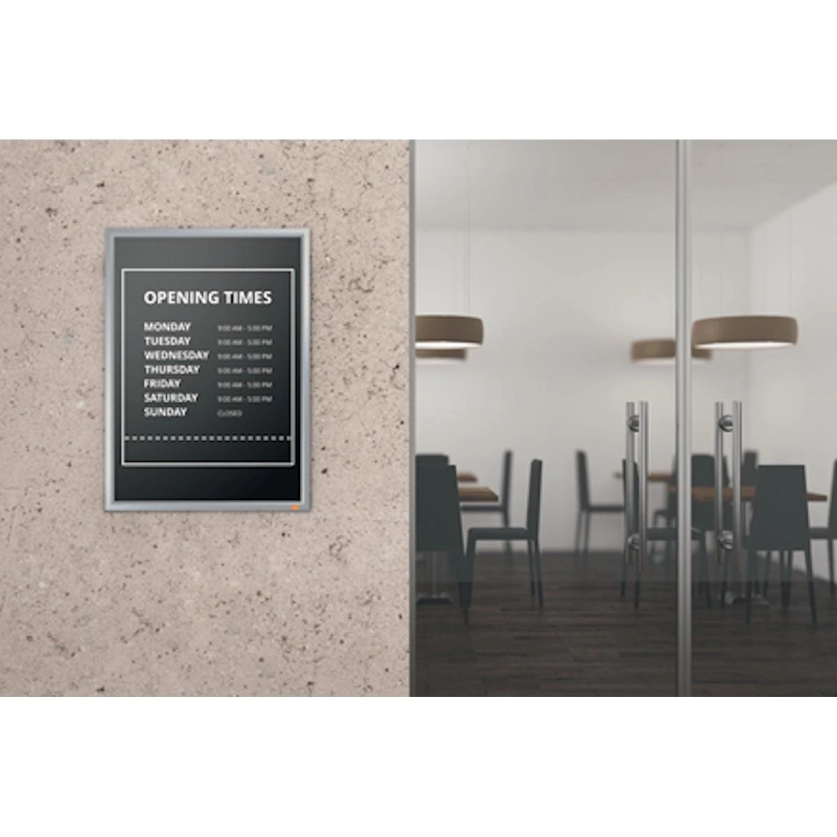 • Mocowana do ściany, stylowa, niskoprofilowa ramka zatrzaskowa ze ściętymi, bezspoinowymi narożnikami i prawdziwie innowacyjnym mechanizmem do wymiany prezentowanych informacji