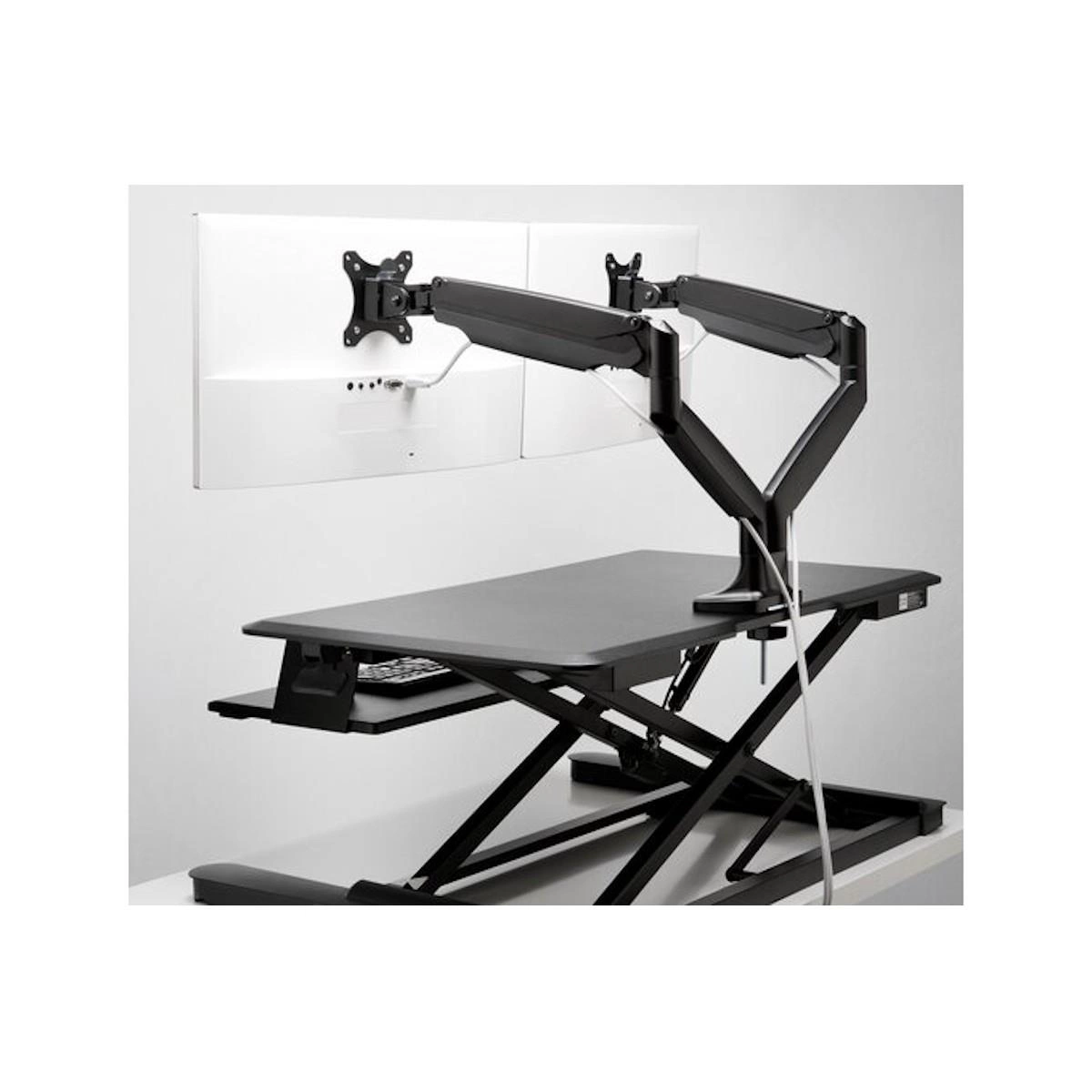 - Wbudowana sprężyna gazowa i regulacja naciągu przeciwwagi umożliwiają bezwysiłkowe i bezproblemowe ustawienie wysokości, odległości i kąta nachylenia monitora