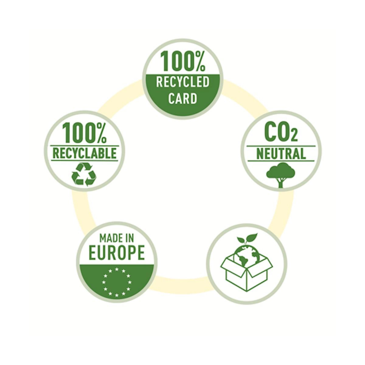- Neutralny dla klimatu, karton w 100% pochodzący z odzysku i w 100% nadający się do recyklingu, z certyfikatami środowiskowymi Blue Angel i FSC