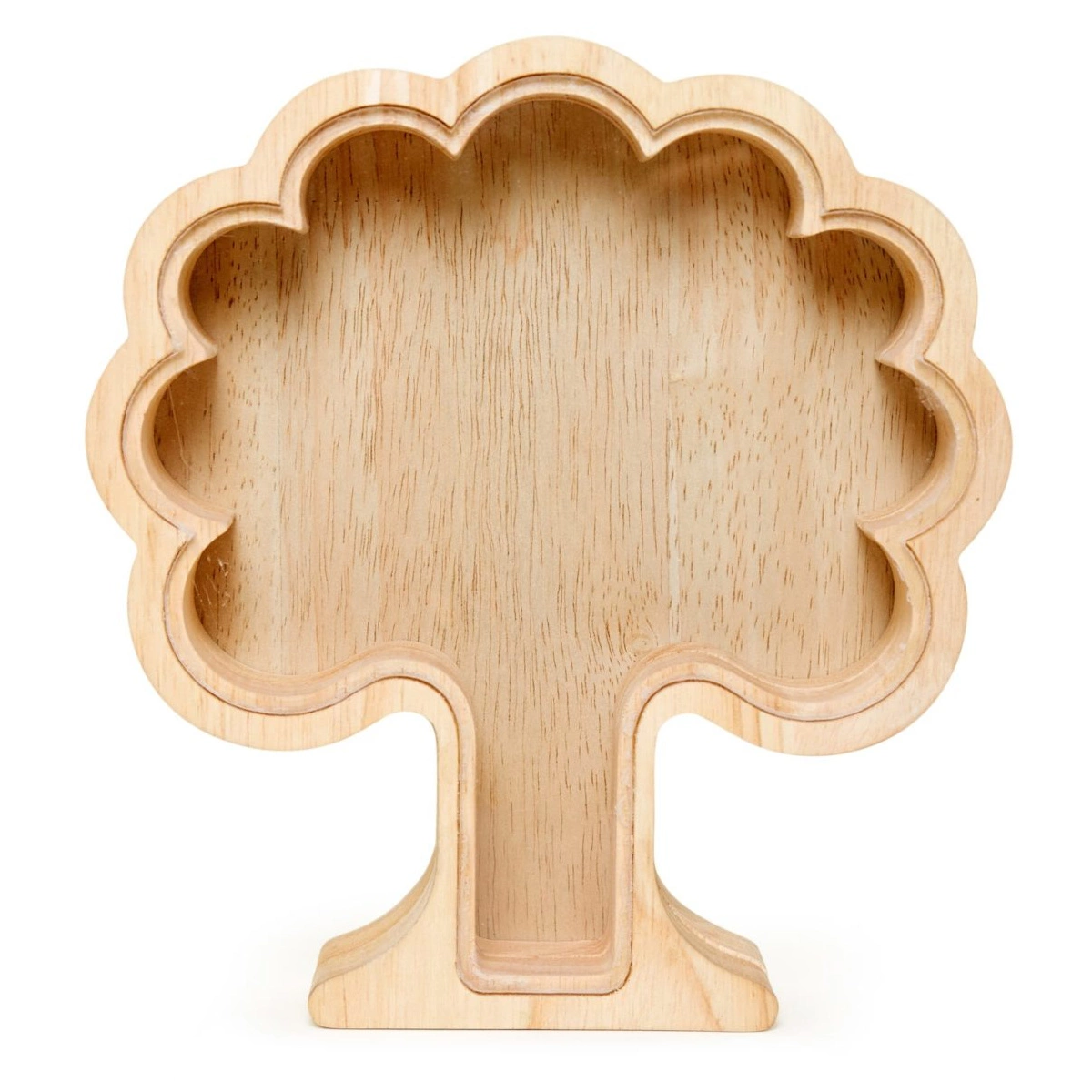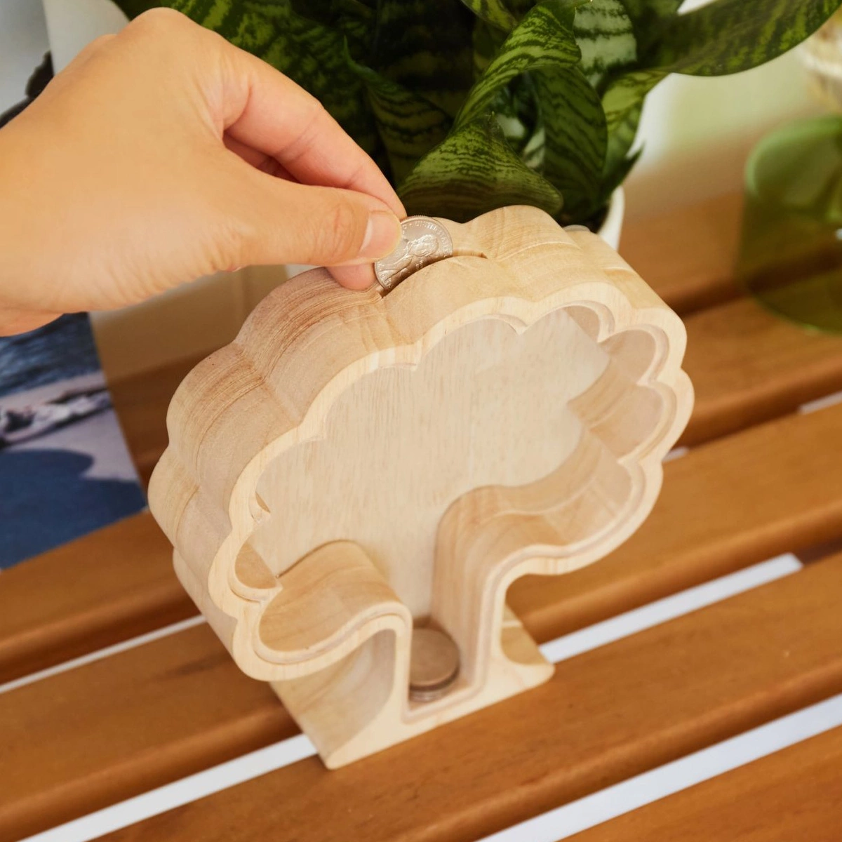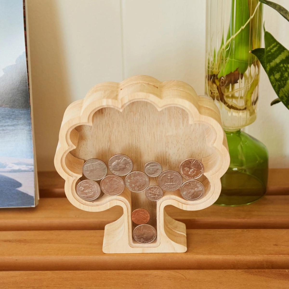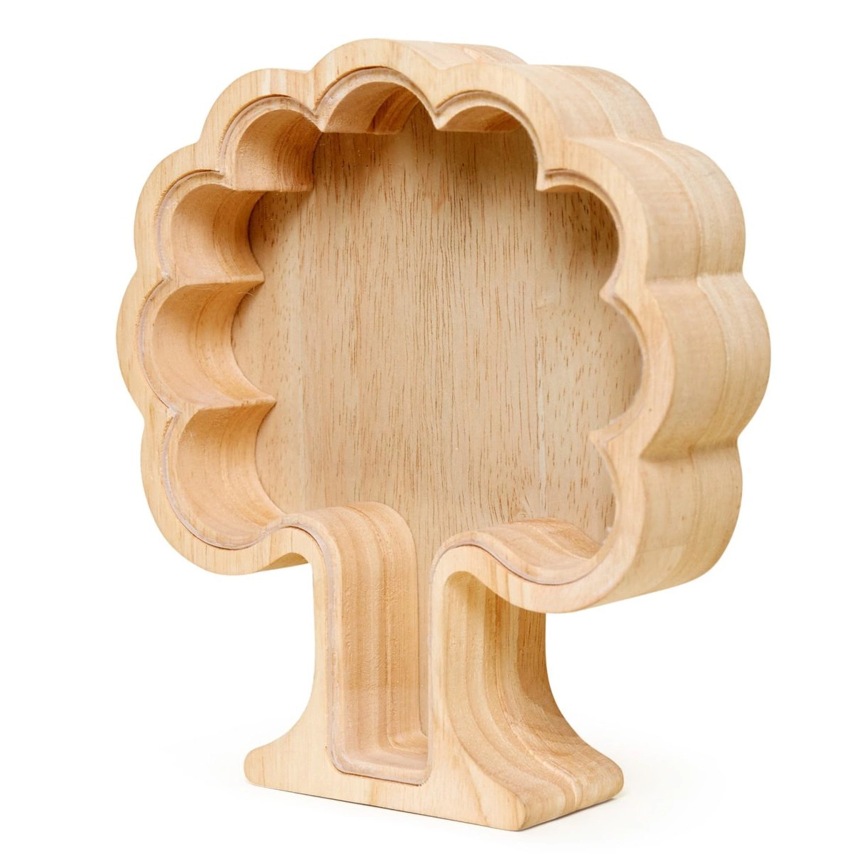 • Drewniana kasa oszczędnościowa w kształcie drzewa.