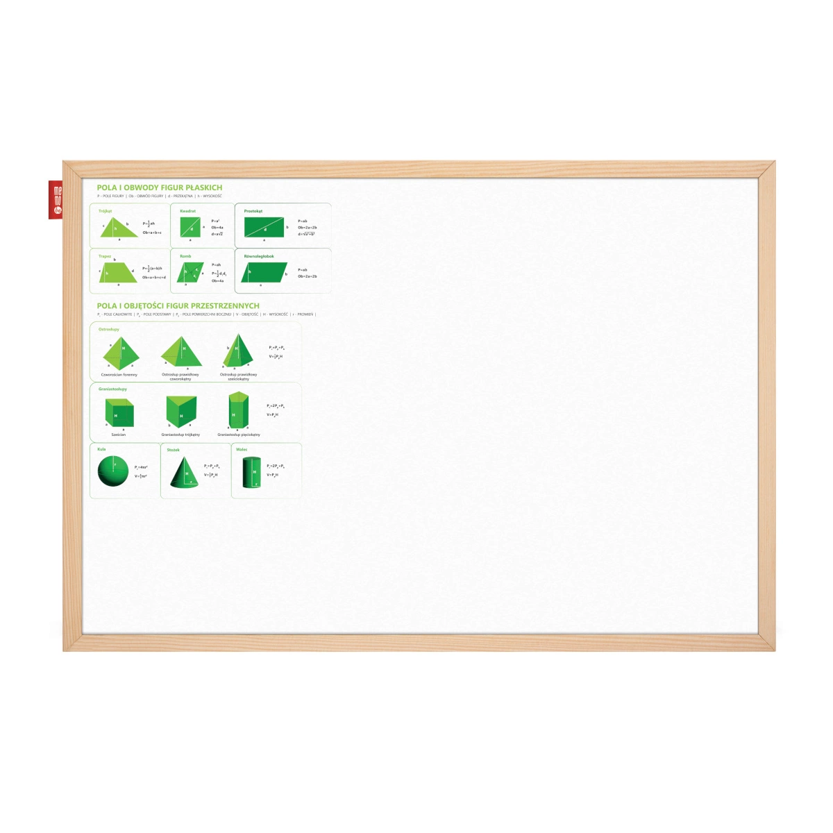 • Tablica z nadrukowaną kolorową tabelą: pól i obwodów figur płaskich oraz pól i objętości figur przestrzennych jest doskonałym wsparciem podczas nauki na lekcjach matematyki