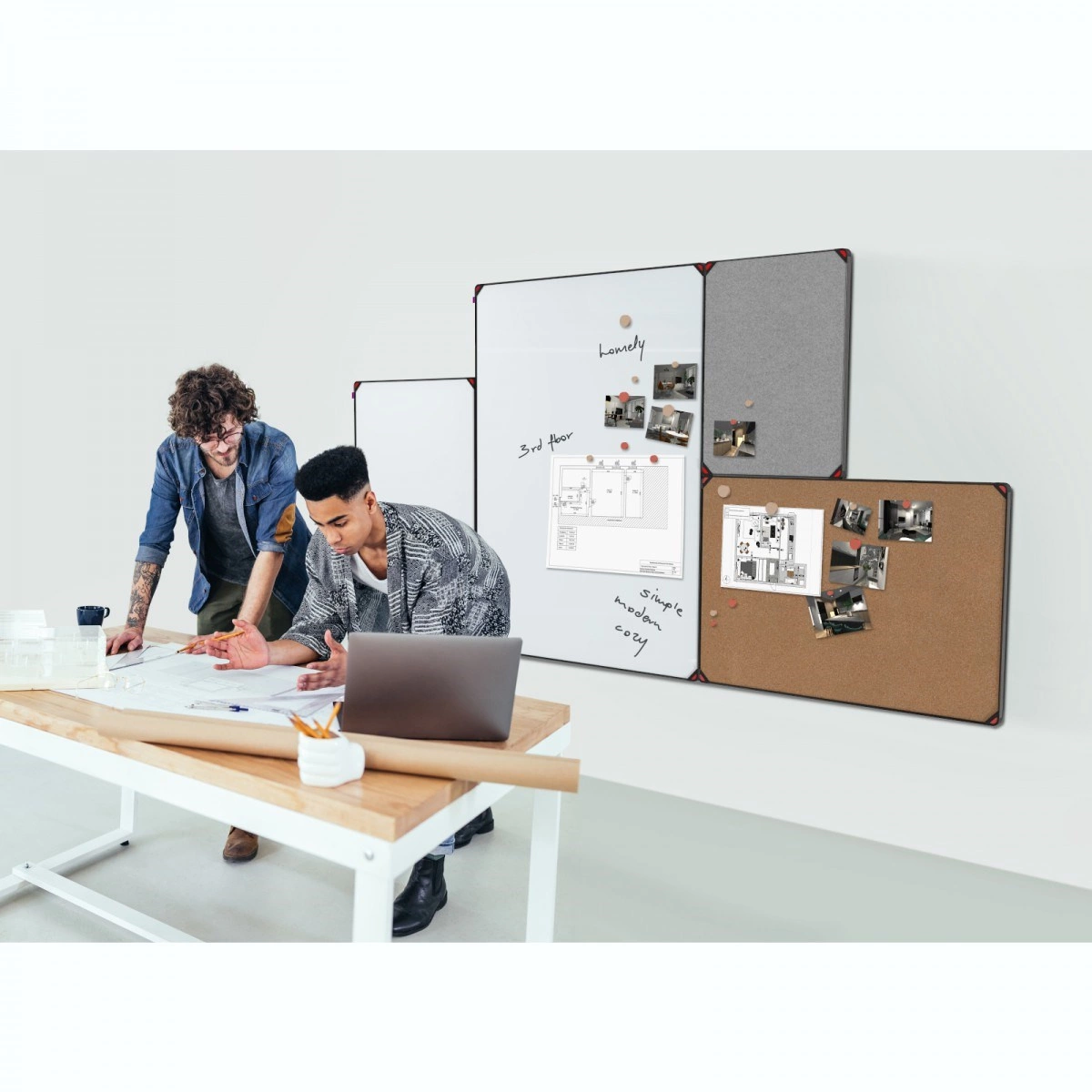 - Tablice można dostosować do indywidualnych preferencji i potrzeb użytkowych dzięki czterem powierzchniom do wyboru oraz trzem różnym rozmiarom dobranym tak, aby łączenie ich w zestawy było wygodne