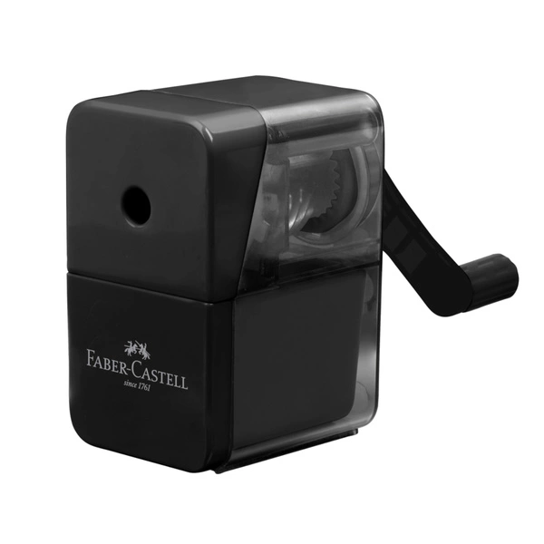 • Temperówka na korbkę Faber-Castell w kolorze czarnym z pojemnikiem na ostrużyny.