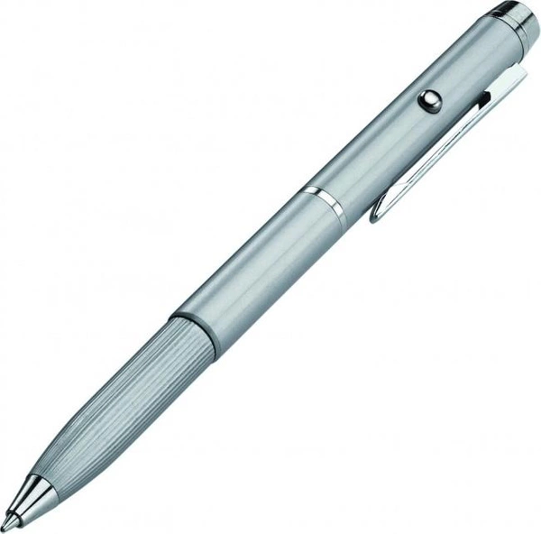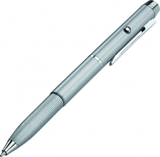 - Srebrny wskaźnik laserowy ze zintegrowanym długopisem.