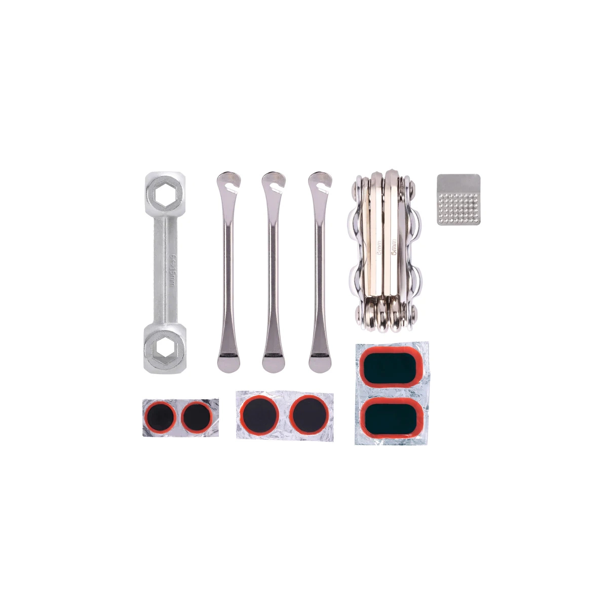 - Zawiera: 6-głowicowy zestaw imbusów, zestaw łatek, dwie metalowe łyżki do opon, klej, polerka i klucz rowerowy.