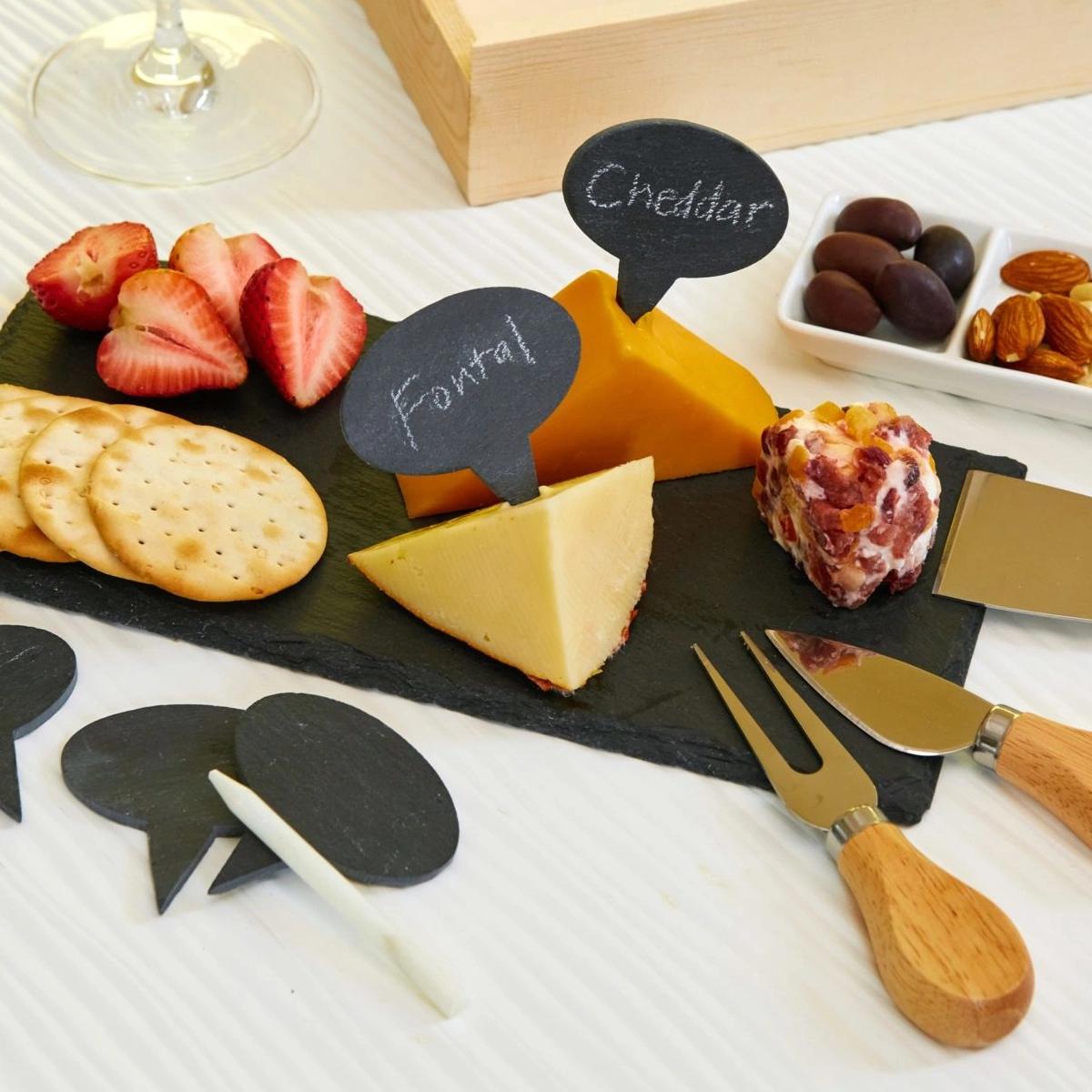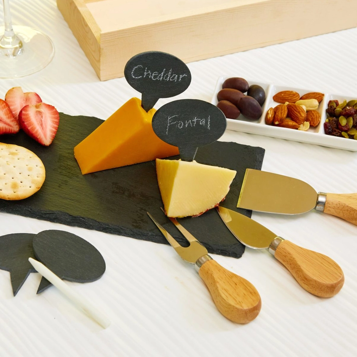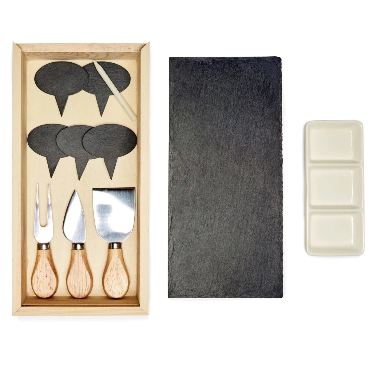 • W zestawie: drewniane pudełko do przechowywania, tablicę łupkową, 3 noże do serwowania, 5 markerów do sera, 1 kreda i taca na dodatki z 3 sekcjami
