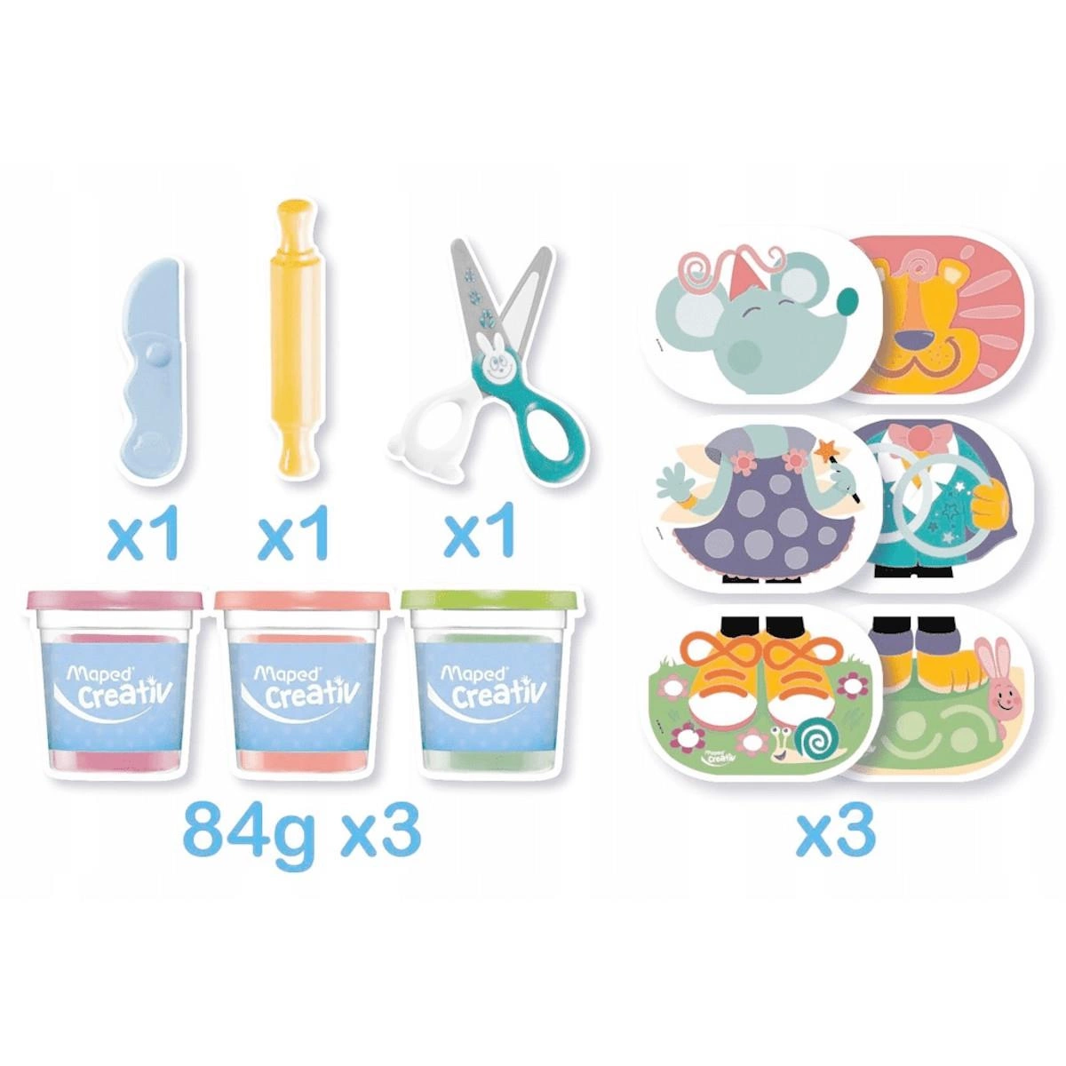 - Zawiera bezpieczne w użyciu nożyczki, 3 pudełka z kolorową plasteliną, zabawkowy nożyk i wałek oraz zestaw 3 kolorowych plansz do zabawy