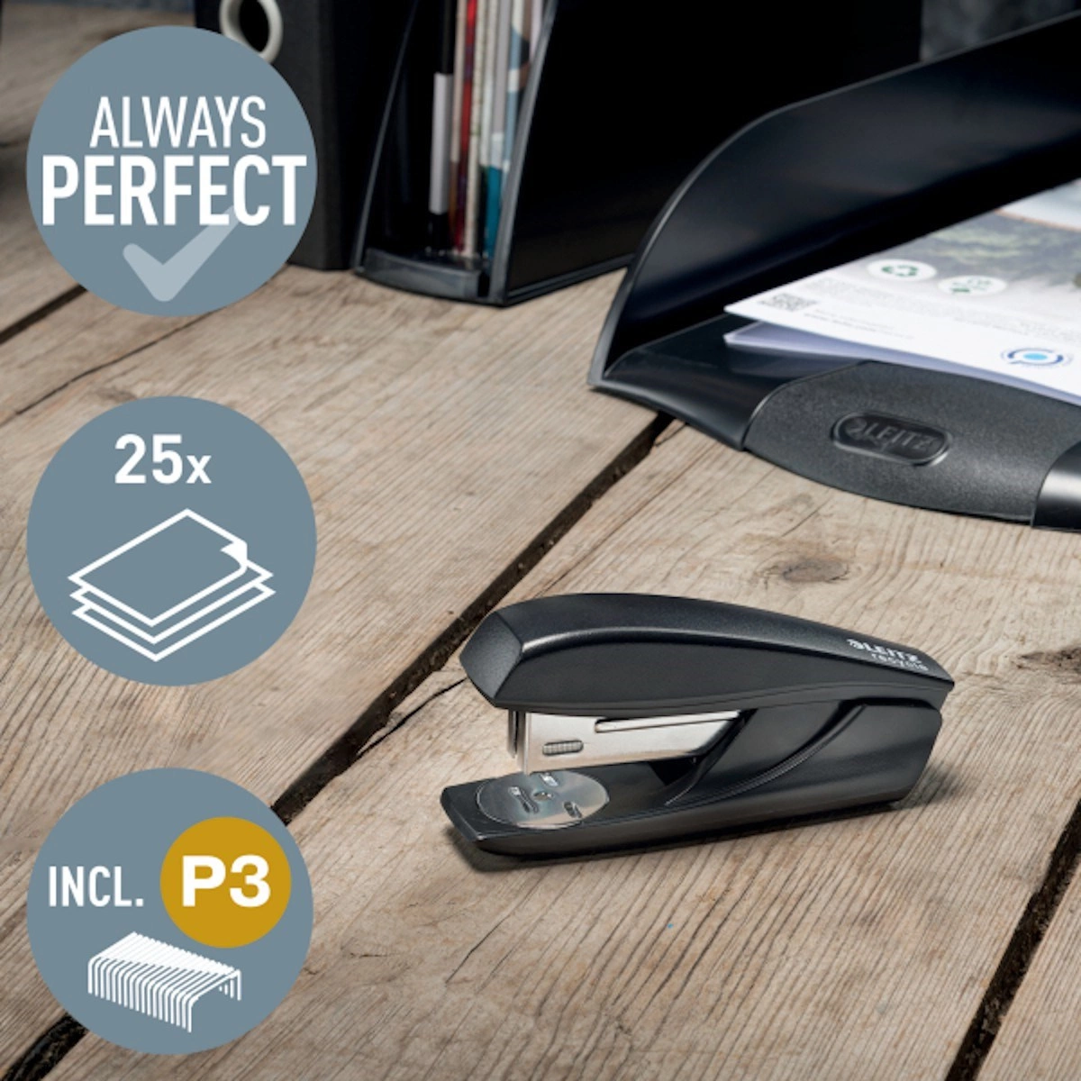 • Opatentowana technologia Direct Impact oraz zszywki Leitz Power Performance P3 (24/6, 26/6) zapewniają doskonałe zszywanie za każdym razem