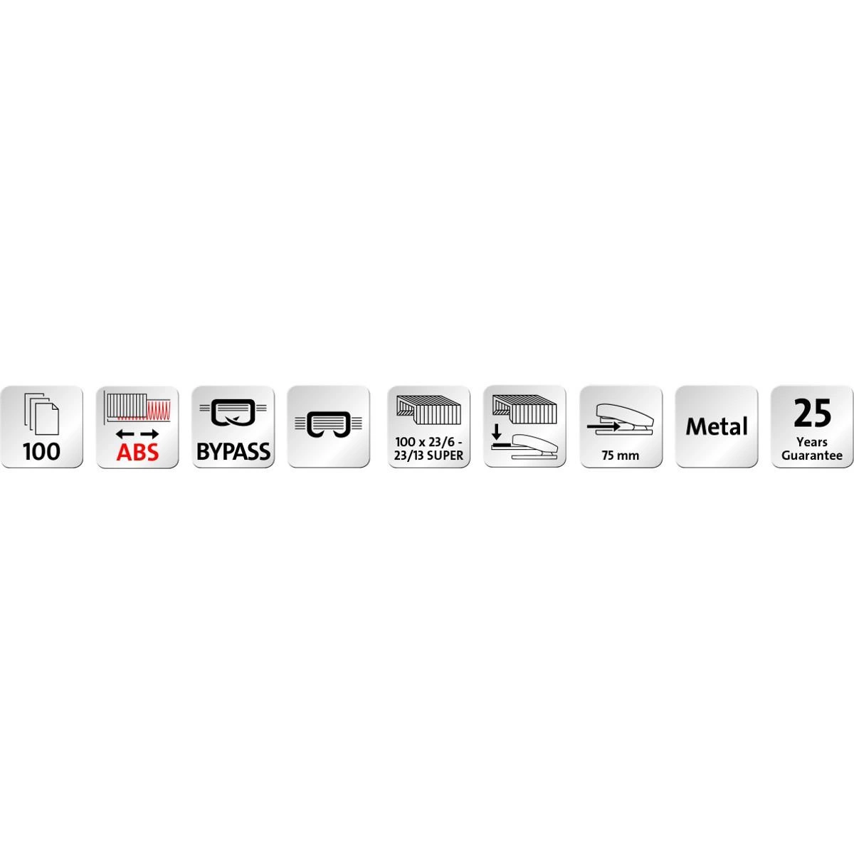 - System ABS – specjalna budowa magazynku uniemożliwia zakleszczenie zszywek w zszywaczu